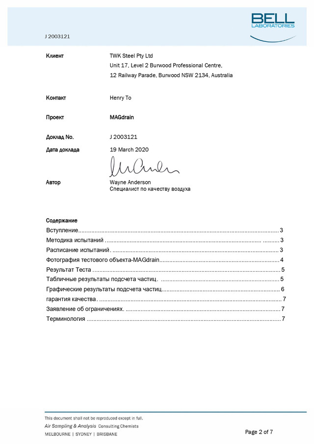 спеціалізується на відборі проб і аналізу якості повітря в житлових приміщеннях і на робочих місцях, було проведено дослідження по визначенню ефективності 38-міліметрового магнітного клапана MAGdrain щодо якості запобігання попадання з каналізаційних стоків запахів, бактерій і вірусів.